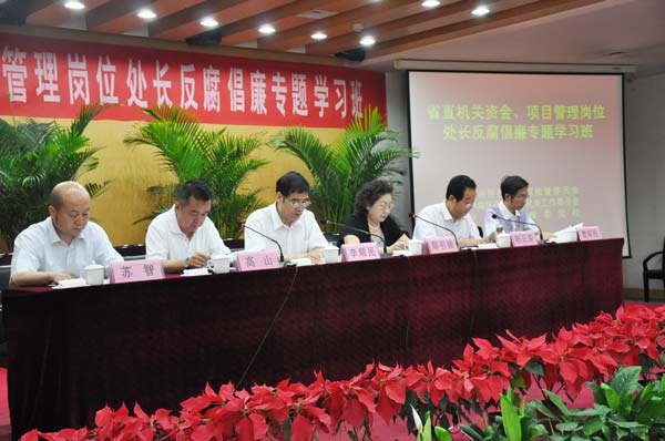 为深入学习贯彻胡锦涛总书记在中纪委三次全会上关于加强党性修养、弘扬优良作风重要讲话精神,围绕今年保增长、保民生、保稳定决策部署的贯彻落实,切实加强对省直机关关键岗位处级领导干部的教育监督,省直机关工委会同省纪委、省委党校,于7月6日至8日在西安联合举办了一期省直机关资金、项目管理岗位处长反腐倡廉专题学习班,省政府工作部门、直属机构、直属事业单位资金、项目管理岗位处长(主任),共106人参加了学习培训。此次学习班以胡锦涛总书记在中纪委三次全会上的重要讲话精神为指导,以贯彻中省纪委三次全会总体部署为主要内容,以深化拓展学习实践科学发展观活动成效为平台,以提高省直机关关键岗位处长廉洁自律意识,为全省经济社会平稳较快发展服好务为目的,采取自学教材、集中讲授、现场教学、研讨交流等方式,强化对学员的廉洁从政专项教育。大家一致反应,培训不误砍柴工,在当前形势下举办这个专题廉政学习班十分必要;能参加这个学习,是党组织对处级领导干部政治上的爱护和能力上的培养;普遍感到心灵得到净化,认识得到升华,终生受用。