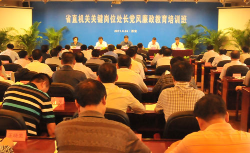 为深入学习贯彻胡锦涛总书记“七一”重要讲话精神,全面构建省直机关惩防腐败体系,省纪委、省直机关工委于8月24至26日在西安联合举办了省直机关关键岗位处长党风廉政教育培训班。省委、省政府主要工作部门、直属机构和事业单位,及部分下属单位负责人财物、行政审批、项目管理及综合执法等关键岗位处长(主任),共106人参加了培训。省直机关工委书记李顺民、省纪委常委高山等领导同志出席开班式,并作重要讲话。