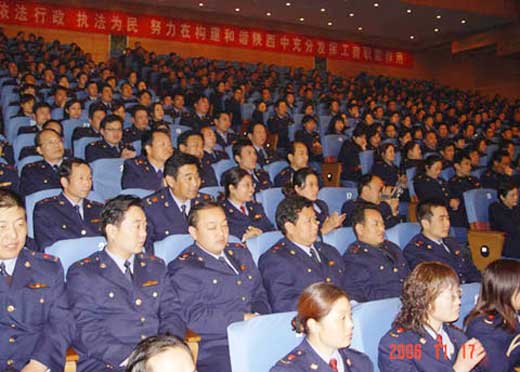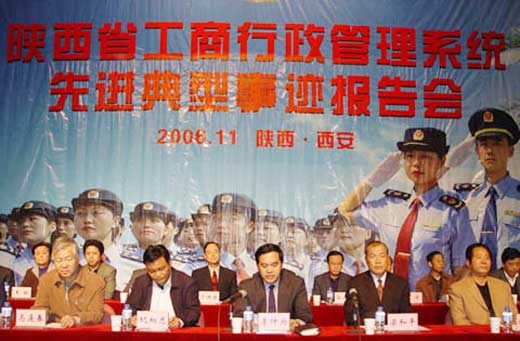 11月17日,全省工商系统先进典型事迹报告会在西安市新城剧场举行。这是继10月下旬以来,报告团在各地先后巡回报告的第10场。来自工商系统基层执法一线的先进集体和先进个人代表报告了他们立足岗位、默默奉献、执法为民、建功立业的先进事迹,彰显先进人物的时代风采,展示工商干部在本职岗位上取得的新成绩。省政府梁和平副秘书长,省纪委常委、监察厅副厅长纪相忠、省直工委杨正荣副书记及省人事厅、省文明办、省纠风办、省妇联等部门的领导也都亲临会议指导。省局领导、省局机关和事业单位以及西安市工商系统、杨凌工商系统干部代表600余人参加了报告会。报告会由省局党组书记、局长李仲为主持,省政府梁和平秘书长作了重要讲话。