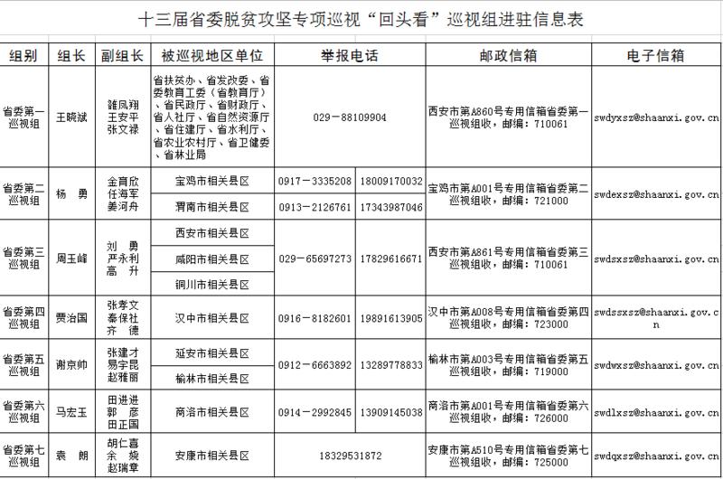 根据安排,省委巡视组将在被巡视地区单位工作20天左右,期间设立信访举报电话和邮政信箱,主要受理涉及脱贫攻坚的信访举报。巡视组受理信访时间截止到2020年5月25日。