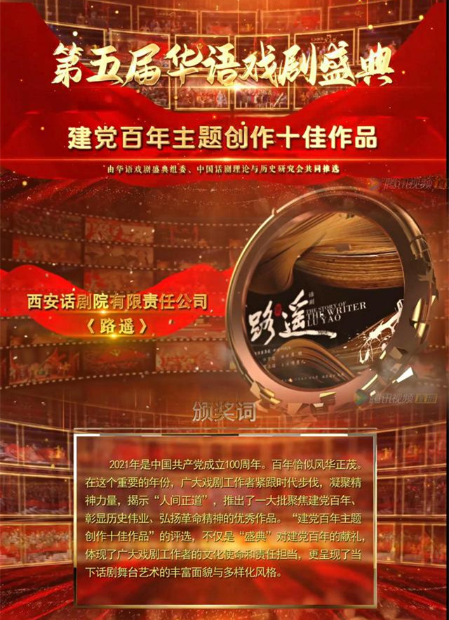 1月23日,第五届华语戏剧颁奖盛典在线上隆重举行。由陕西省纪委监委、陕西省委宣传部、中国方正出版社联合出品,西安话剧院创作的廉政题材话剧《路遥》,被华语戏剧盛典组委会评审委员会、中国话剧理论与历史研究会共同推荐为第五届华语戏剧盛典“建党百年主题创作十佳作品”。话剧《路遥》作为陕西省纪委监委打造的“一戏一剧一片”廉政文化精品项目之一,此前已在全国巡演40余场,入选中宣部、文旅部、中国文联举办的庆祝中国共产党成立100周年优秀舞台艺术作品展演,并在国家大剧院演出。