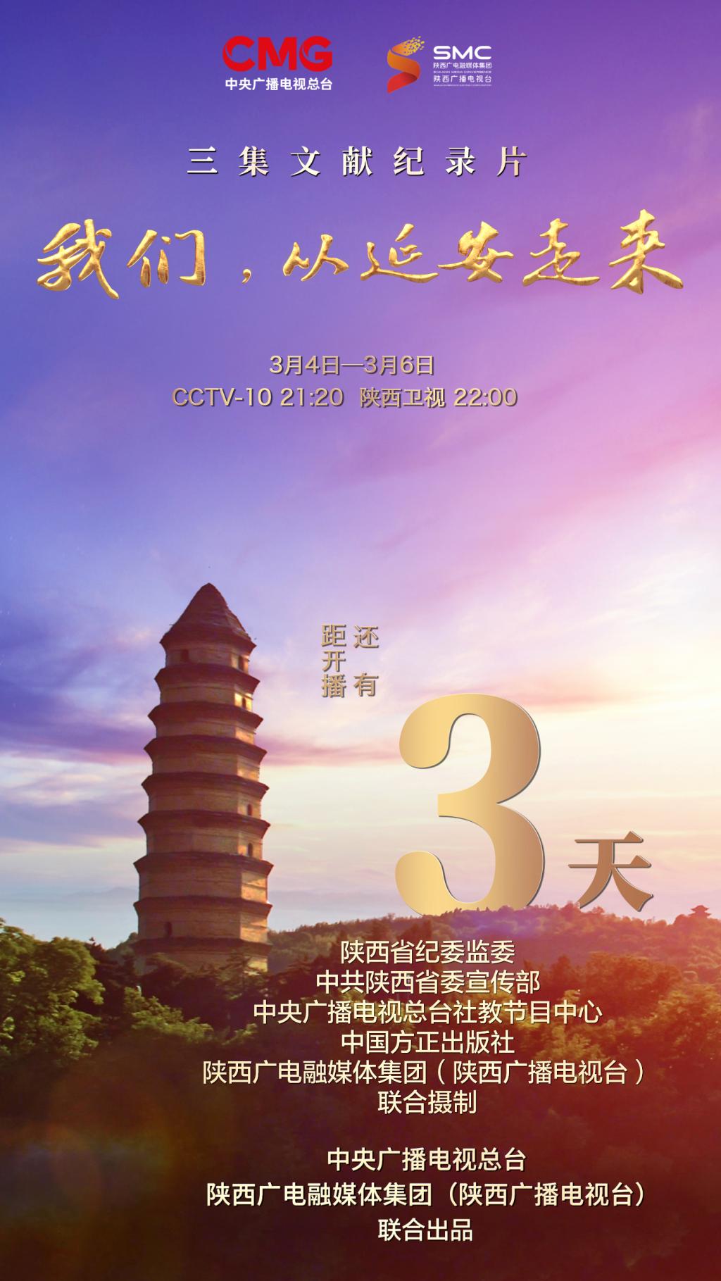 由省纪委监委、省委宣传部、中央广播电视总台社教节目中心、中国方正出版社、陕西广电融媒体集团联合摄制,中央广播电视总台、陕西广电融媒体集团联合出品的三集文献纪录片《我们,从延安走来》将于3月4日-6日在中央广播电视总台科教频道(CCTV-10)21:20播出,每天一集。同时陕西卫视将于央视播出当晚1小时后复播。