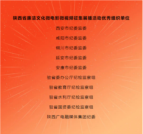 近日,省纪委机关联合省委网信办、省文联印发通报,对陕西省廉洁文化微电影微视频征集展播活动评选出的《一张电影票》《廉洁之花遍地开》等95部作品,西安市纪委监委、驻省委办公厅纪检监察组等10家优秀组织单位进行表彰。同时对获奖作品进行多平台网络展播,营造了崇廉尚洁、抵制腐败的良好社会风尚。