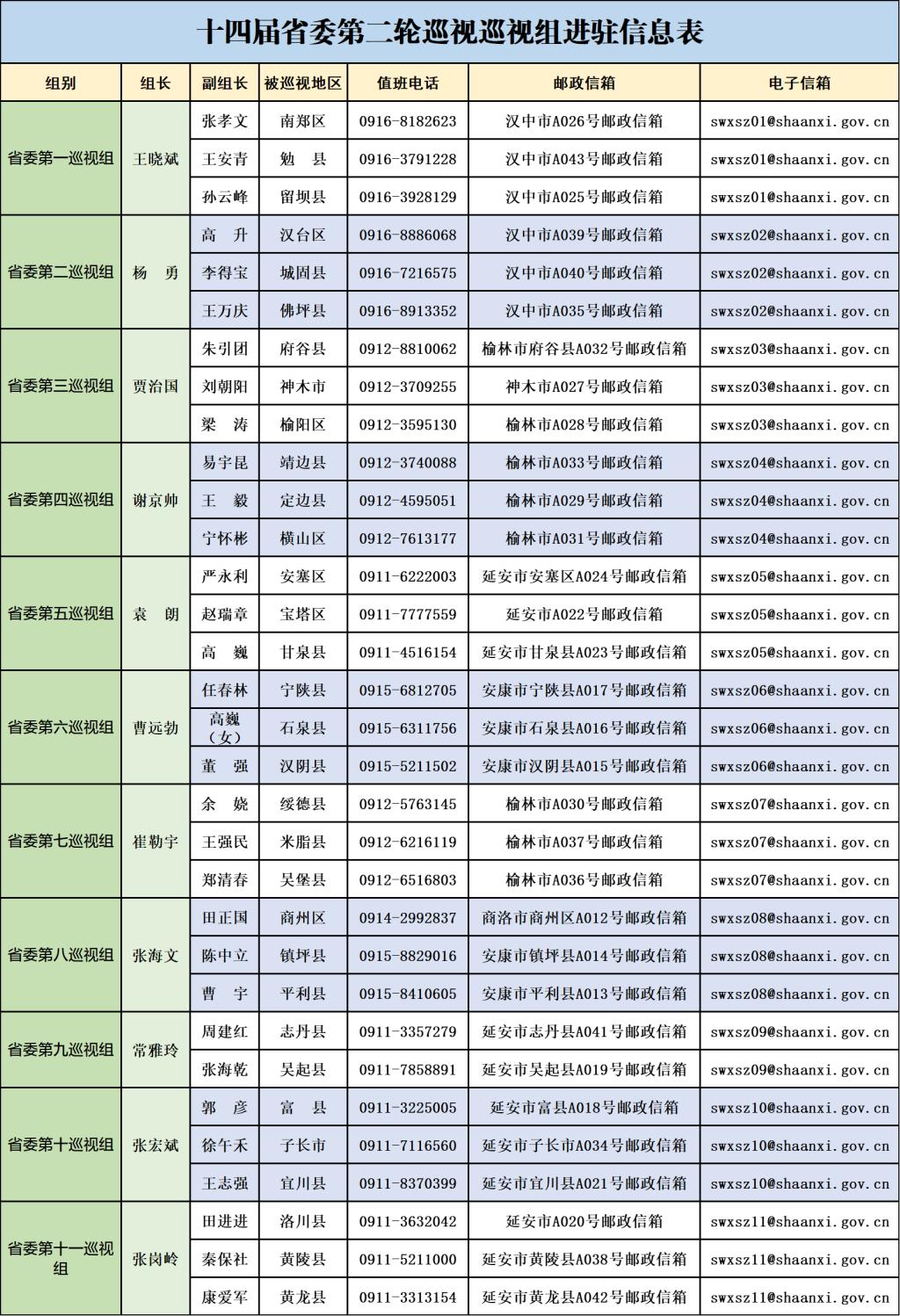 经省委批准,十四届省委第二轮巡视对延安市宝塔区、安塞区、吴起县、志丹县、子长市、甘泉县、富县、洛川县、黄陵县、宜川县、黄龙县,榆林市榆阳区、横山区、神木市、府谷县、定边县、靖边县、绥德县、米脂县、吴堡县,汉中市汉台区、南郑区、城固县、勉县、留坝县、佛坪县,安康市汉阴县、石泉县、宁陕县、平利县、镇坪县,商洛市商州区等32个县市区开展常规巡视。