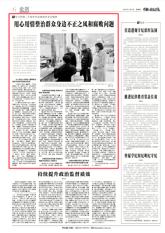 《中国纪检监察报》2025年4月3日第六版“学习贯彻二十届中央纪委四次全会精神”栏目刊发陕西省委常委、省纪委书记、省监委主任王兴宁署名文章《用心用情整治群众身边不正之风和腐败问题》,现予以全文转载。