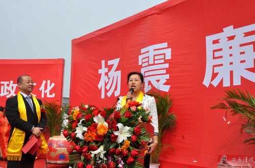 郝宗友在落成典礼上说,潼关县委、县政府充分挖掘历史文化资源,积极建设杨震廉政教育基地,有效地传承了先贤遗风,弘扬了浩然正气,实现了传统文化与廉政文化的有机结合,为全市的反腐倡廉教育搭建了重要平台,也为我市广大党员干部接受反腐倡廉教育提供了重要载体,标志着全市在建设廉政文化精品工程方面迈出新的重要的一步。