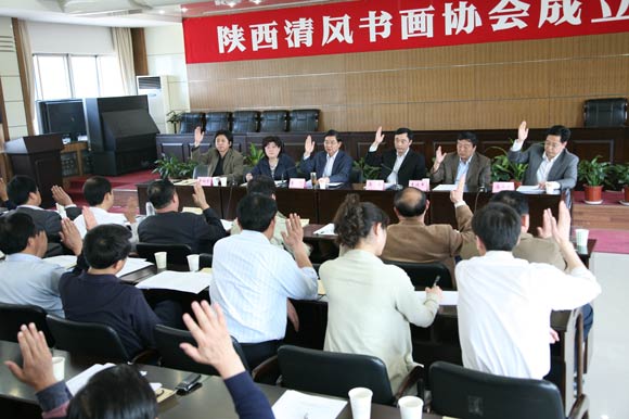 大会通过了《陕西清风书画协会章程》和《陕西清风书画协会会费管理办法》,选举产生了第一届理事会和主席、副主席、秘书长及副秘书长,并特请省委常委、省纪委书记郭永平同志担任名誉主席。