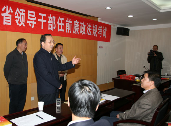 11月24日下午,我省25位拟任命的副厅级领导干部在省委党校集中参加了任前廉政法规考试。这是我省第一次对拟任副厅级领导干部组织任前廉政法规考试,标志着我省任前“考廉”制度的进一步健全和完善。省委常委、省纪委书记郭永平,省委常委、省委组织部部长李锦斌到考场看望了参加考试人员。