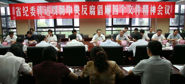 7月17日下午,省纪委召开常委扩大会议,传达学习全国纪委书记座谈会精神,并就我省贯彻落实中央反腐倡廉四个法规和文件进行安排部署。省委常委、省纪委书记郭永平强调,全省各级纪检监察机关要充分认识中央出台四个文件的重大意义,把贯彻落实四个文件作为当前工作的重中之重,切实增强工作的责任感和紧迫感,不断提高党风廉政建设水平,推动反腐败斗争深入开展。