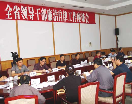 全省领导干部廉洁自律工作座谈会于2004年9月3日在西安召开。出席会议的有各市(区)纪委分管廉洁自律工作的副书记和党风室主任、省直机关部分纪检组长、纪工委书记。会议由省纪委常委魏燕同志主持。主要议题是:纪委分管领导同志汇报上半年以来廉洁自律工作情况;传达了中纪委在福州召开的部分省区市领导干部廉洁自律工作座谈会精神;省纪委副书记马文新同志代表省纪委对今年后4个月廉洁自律几项重点工作以及明年治理“向领导干部送现金、有价证券,跑官要官、领导干部配偶子女违规从业、党员干部赌博”等四股歪风工作做了安排和部署。