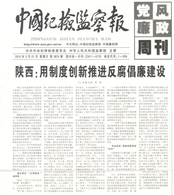 2009年是陕西省纪委确定的“反腐倡廉制度建设创新年”。通过一年来的实践,陕西省纪委在总结基层经验的基础上形成的村民监督委员会制度、党政主要领导干部向纪委全委会述廉制度、党风廉政建设责任制工作报告制度、纪检监察领导干部挂牌群众点名接访制度、领导干部任前廉政法规考试制度等“五项制度”,彰显出强大的生命力。