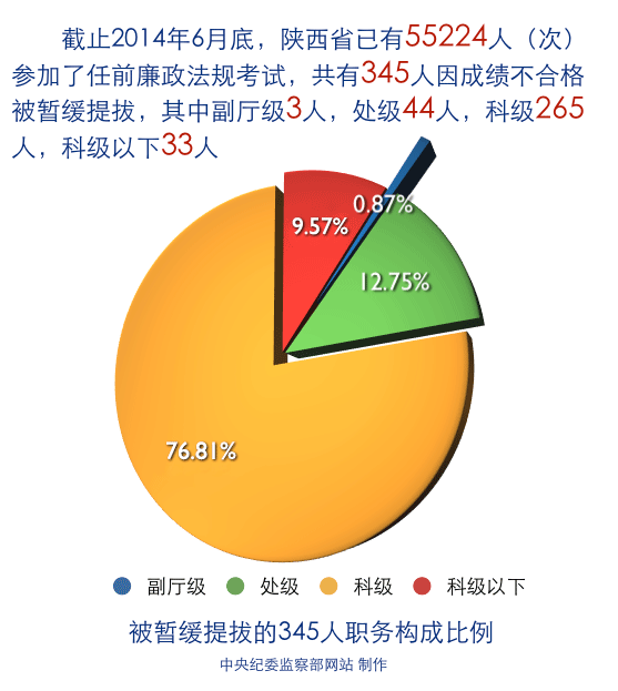 截止2014年6月底,陕西省已有55224人(次)参加了任前廉政法规考试,共有345人因成绩不合格被暂缓提拔,其中副厅级3人,处级44人,科级265人,科级以下33人。