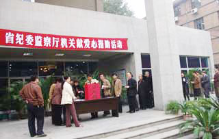 按照陕办字[2004]65号《关于开展扶贫帮困捐助月活动的通知》精神,省纪委、监察厅机关干部职工踊跃捐款捐物,10月20日上午,委厅领导和机关干部职工在不到1小时的时间里,共捐款15260元,衣物271件,被子17条。捐助活动中,原省委常委、纪委书记李焕政同志专门前来参加捐助活动,委厅机关离退休老同志也参加了捐助活动。