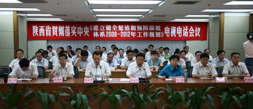 5月30日上午,陕西省召开全省电视电话会议,贯彻落实《建立健全惩治和预防腐败体系2008—2012年工作规划》。省委书记、省人大常委会主任、省党建领导小组组长赵乐际,省委副书记、省党建领导小组副组长王侠,省委常委、省纪委书记郭永平,省委常委、省政府副省长洪峰,省人大常委会副主任赵德全,省高级人民法院院长安东,省人民检察院检察长胡太平,省纪委、监察厅领导班子成员参加了会议。