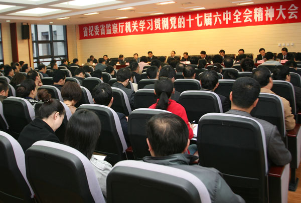 10月25日上午,省纪委、省监察厅机关及巡视机构召开全体党员干部大会,学习传达党的十七届六中全会精神,对贯彻落实全会精神进行了安排部署。省委常委、省纪委书记郭永平在讲话中要求,要全面学习深刻领会全会精神,充分发挥我省文化资源优势,深入推进廉政文化建设。省纪委、省监察厅领导龚汉江、纪相忠、张毅民、魏燕、马奔、岳崇、王晓斌、贠军、郭润芝、高山、高霄出席会议。