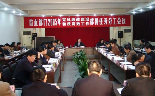 2005年3月17日下午,省党风廉政建设责任制领导小组专门召开省直部门2005年党风廉政建设和反腐败工作部署任务分工会议,省直25个牵头部门的主要领导和省纪委有关室处负责人共46名同志出席会议。会议由省党风廉政建设责任制领导小组办公室主任、省纪委副书记马文新主持,省党风廉政建设责任制领导小组办公室副主任、省纪委常委魏燕宣读了《2005年全省党风廉政建设和反腐败工作目标管理责任一览表》。省纪委副书记、省监察厅厅长陈有德受省党风廉政建设责任制领导小组的委托出席会议并讲话。