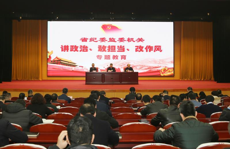 1月14日上午,省纪委监委机关召开警示教育大会,集中观看中央电视台《一抓到底正风纪——秦岭违建整治始末》新闻专题片、《省委“讲政治、敢担当、改作风”专题警示教育片》和《贪与悔——佳县县委原书记辛耀峰案的警示》等3部专题警示教育片,开展警示教育。省纪委副书记、省监委副主任王舸主持大会,委机关、省委巡视机构全体干部参加会议。