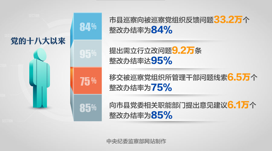 巡察监督充分发挥标本兼治综合效应。党的十八大以来,市县巡察向被巡察党组织反馈问题33.2万个、整改办结率为84%,提出需立行立改问题9.2万条、整改办结率达95%,移交被巡察党组织所管理干部问题线索6.5万个、整改办结率为75%,向市县党委相关职能部门提出意见建议6.1万个、整改办结率为85%。