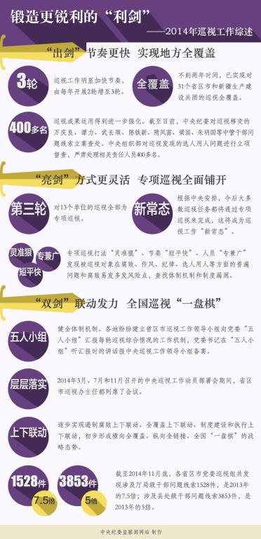 在党中央坚强有力领导下,2014年党风廉政建设和反腐败斗争深入推进,从严治党取得新成效、形成新常态,为推进全面深化改革、依法治国提供了有力保证。巡视作为党内监督的战略性制度安排,过往这一年,在创新中发展,在发展中深化,明确新定位、探索新打法、形成新常态。巡视“利剑”作用彰显,强度、力度、效果前所未有,得到了中央充分肯定和群众衷心拥护。