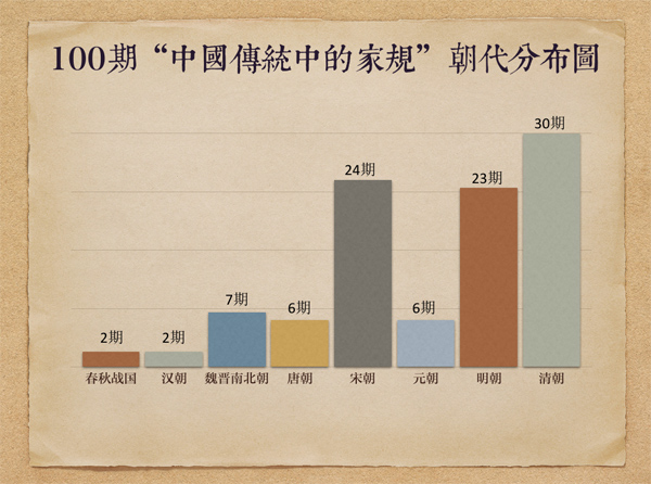 100期传统家规中,诞生于宋朝、明朝、清朝的家规较多。其中,明清时期的家规数量更是超过一半。学界一般认为,中国古代的家规家训成型于两汉,成熟于隋唐,繁荣于宋元,明清达到鼎盛。在明清时期,家规家训的普及达到了新的阶段,家规文本大量增加,其中的许多名言警句成为人们服膺的治家良策或修身典范,而家族名人的世代辈出、繁衍长久,也让这些家规的社会影响十分久远。