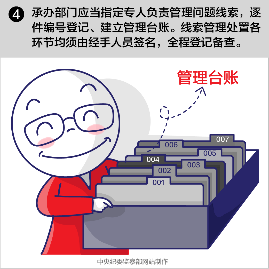 第十四条案件监督管理部门对问题线索实行集中管理、动态更新、定期汇总核对,提出分办意见,报纪检机关主要负责人批准,按程序移送承办部门。承办部门应当指定专人负责管理问题线索,逐件编号登记、建立管理台账。线索管理处置各环节均须由经手人员签名,全程登记备查。