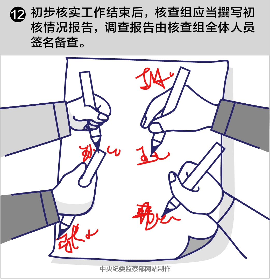 第二十四条初步核实工作结束后,核查组应当撰写初核情况报告,列明被核查人基本情况、反映的主要问题、办理依据及初核结果、存在疑点、处理建议,由核查组全体人员签名备查。