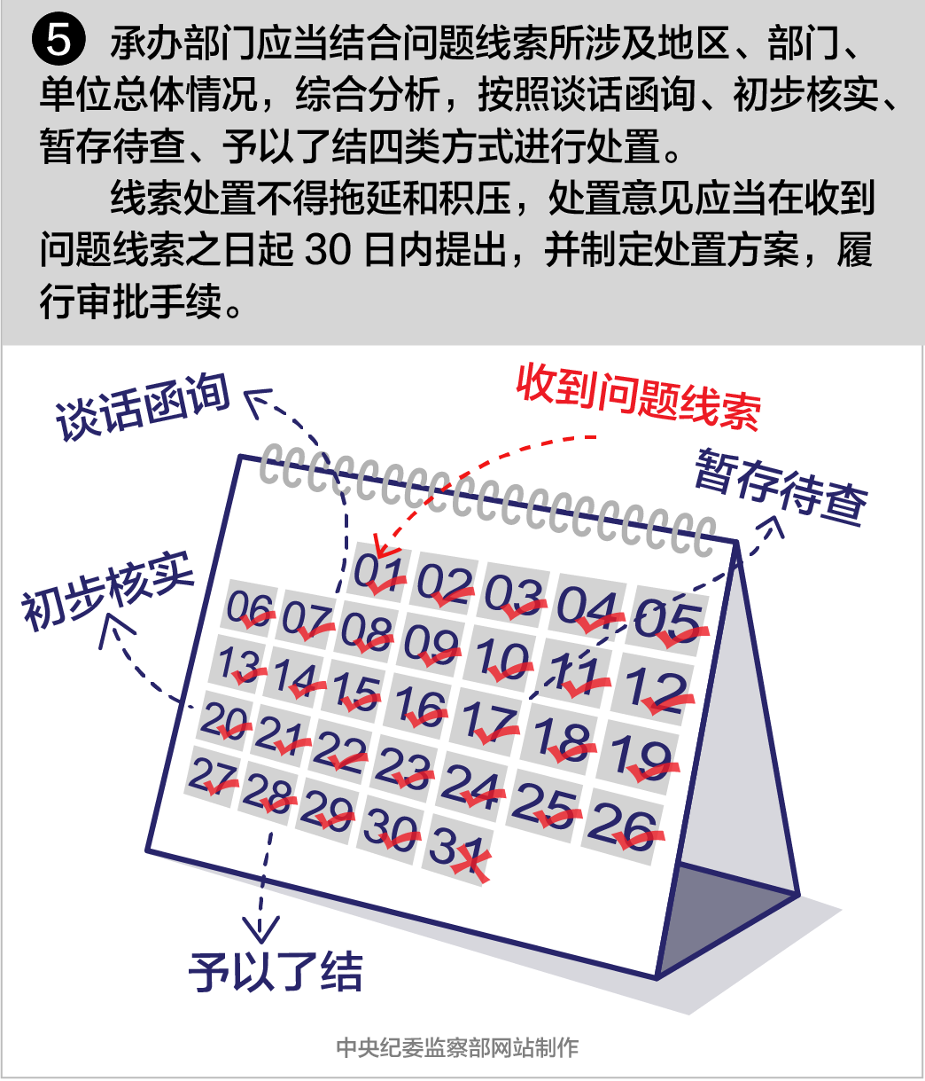 线索处置不得拖延和积压,处置意见应当在收到问题线索之日起30日内提出,并制定处置方案,履行审批手续。