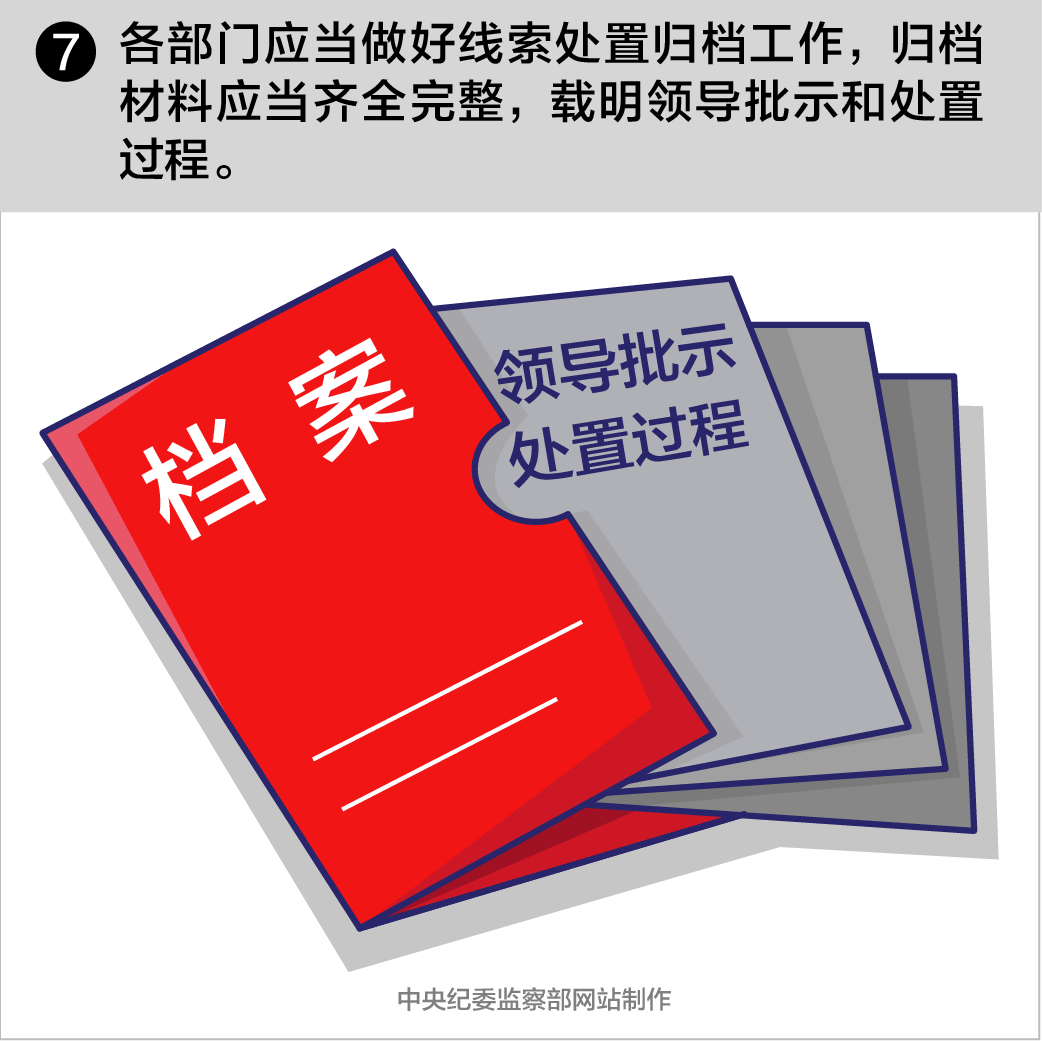 各部门应当做好线索处置归档工作,归档材料应当齐全完整,载明领导批示和处置过程。