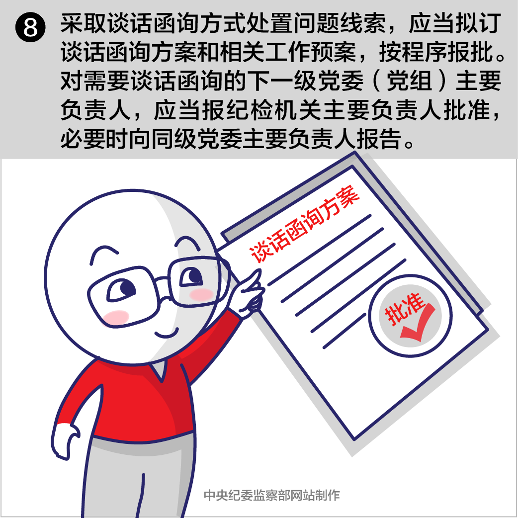 第十八条采取谈话函询方式处置问题线索,应当拟订谈话函询方案和相关工作预案,按程序报批。对需要谈话函询的下一级党委(党组)主要负责人,应当报纪检机关主要负责人批准,必要时向同级党委主要负责人报告。