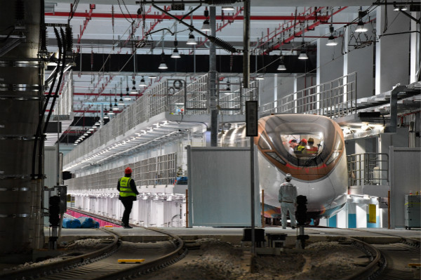 3月3日,广州地铁18号线时速160公里电客车停靠在陇枕停车场,静待热滑试验。 新华社记者 刘大伟 摄