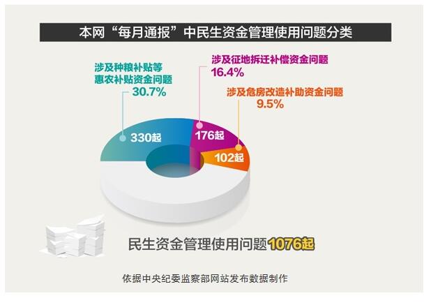 基层腐败问题点多面广,在涉及民生资金管理使用的问题中有三类问题较突出:涉及种粮补贴等惠农补贴资金问题330起、涉及征地拆迁补偿资金问题176起、涉及危房改造补助资金问题102起,分别占民生资金管理使用问题的30.7%、16.4%、9.5%。