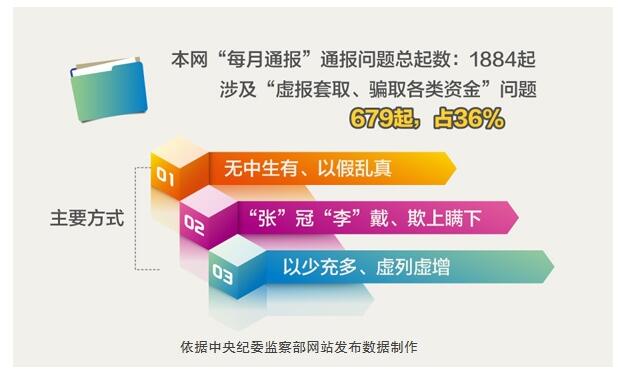在本网“每月通报”的1884起问题中,679起涉及虚报套取、骗取各类资金,占总数36%。
