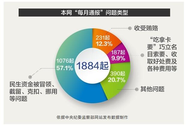 16次“每月通报”的1884起问题中,涉及民生资金被冒领、截留、克扣、挪用等问题共1076起,占57.1%。