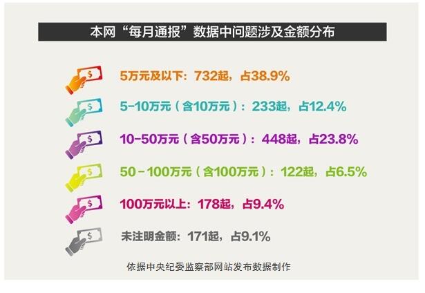 梳理本网“每月通报”的1884起问题,涉及金额在5万元及以下的有732起,占38.9%。