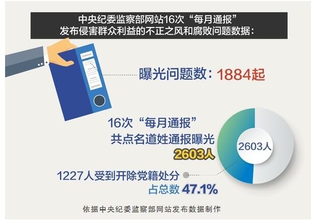 据中央纪委监察部网站“每月通报”发布数据显示,自2015年7月始,16次“每月通报”共曝光侵害群众利益的不正之风和腐败问题1884起,点名道姓通报曝光2603人,其中有1227人受到开除党籍处分,占总人数47.1%。各级纪检监察机关始终保持遏制腐败的高压态势,释放越往后执纪越严的强烈信号。