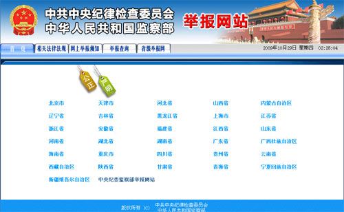 为统一规范全国省级纪检监察机关举报网站建设工作,中央纪委监察部对各省(区、市)举报网站规范了域名,提出了建设标准和开通运行的时间要求,并在中央纪委监察部举报网站上建立了统一的访问入口页面。这是中央纪委监察部继2008年6月26日开通全国统一举报电话12388以来,拓宽信访举报渠道,充分发挥群众监督作用的又一重要举措。今后准备在省(区、市)纪检监察机关开通举报网站的基础上,逐步建立市、县级举报网站,最终形成覆盖全国的纪检监察网络举报体系。
