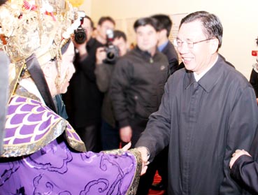 演出前,贺国强、尉健行、吴官正、何勇等会见了该剧主要演创人员,并和大家合影留念。