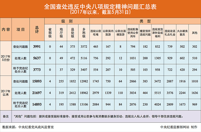 为掌握全国贯彻落实中央八项规定精神情况,中央纪委在31个省区市和新疆生产建设兵团、139个中央和国家机关、102个中央企业、15个中央金融企业建立了落实中央八项规定精神情况月报制度。2017年以来,截至5月31日,全国查处违反中央八项规定精神问题情况如下: