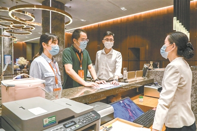 江苏省宜兴市纪委监委紧盯隐形变异“四风”问题,联合有关部门组成专项督查组到酒店、餐馆等处开展监督检查,通过调阅财务账册、消费明细、发票底单等查找有关线索,严查违规吃喝问题。图为近日,督查组在某酒店了解情况。褚亮 摄