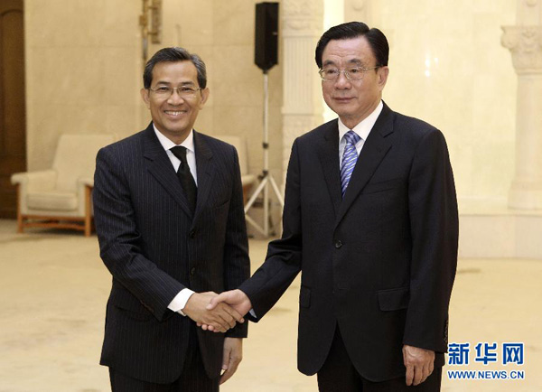 贺国强代表中共中央对柬埔寨奉辛比克党代表访华表示欢迎。他说,中柬建交54年来,由西哈努克太皇同中国几代领导人共同缔造和精心培育的中柬传统友谊焕发出强大生机和活力。两国睦邻友好关系牢固,各领域务实合作深入发展,在国际和地区事务中配合密切。不久前,胡锦涛主席成功访柬,与柬方领导人就深化中柬全面合作深入交换意见,有力提升了中柬全面战略合作水平,并推动了中国-东盟关系及区域合作。