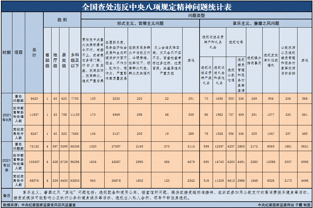 10月28日,中央纪委国家监委公布了2021年9月全国查处违反中央八项规定精神问题汇总情况。今年9月,全国各级纪检监察机关共查处违反中央八项规定精神问题8420起,批评教育帮助和处理11937人,其中党纪政务处分8247人。这是中央纪委国家监委连续第97个月公布月报数据。