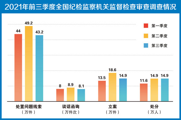 2021年前三季度,全国纪检监察机关处置问题线索136.4万件,立案47万件,处分41.4万人,处分省部级干部22人;2021年1至11月,查处“四风”问题9.1万起,批评教育帮助和处理13.1万人……一组组数据,呈现出一份生动的正风肃纪反腐成绩单,彰显2021年全面从严治党力度强度,彰显党中央把严的主基调长期坚持下去的决心意志。