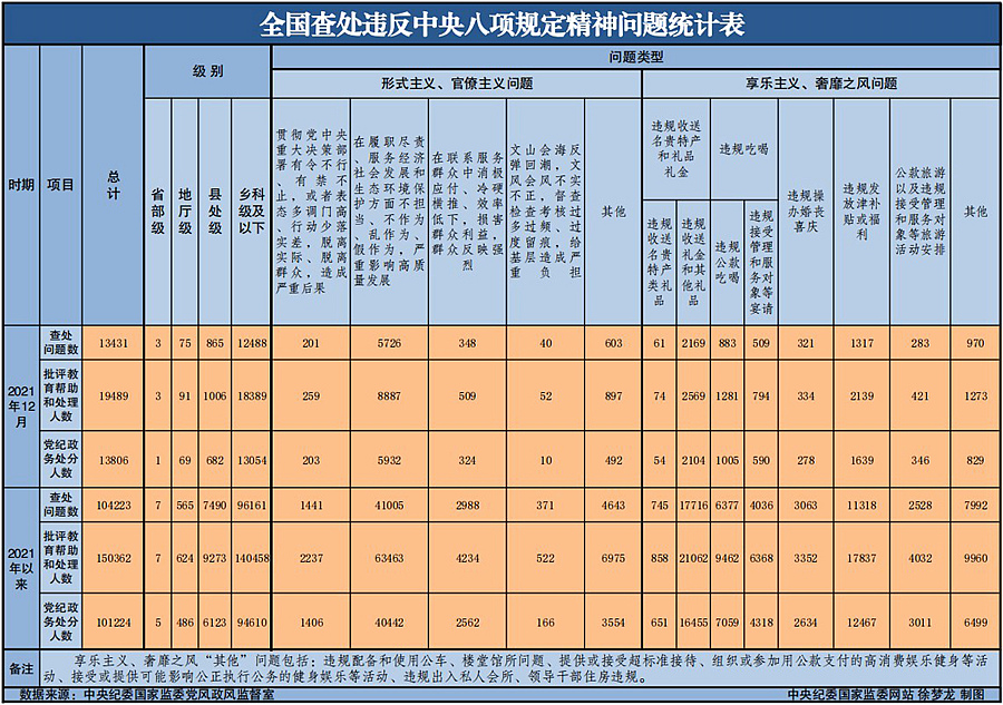 2021年,全国共查处违反中央八项规定精神问题104223起,批评教育帮助和处理150362人,其中党纪政务处分101224人。