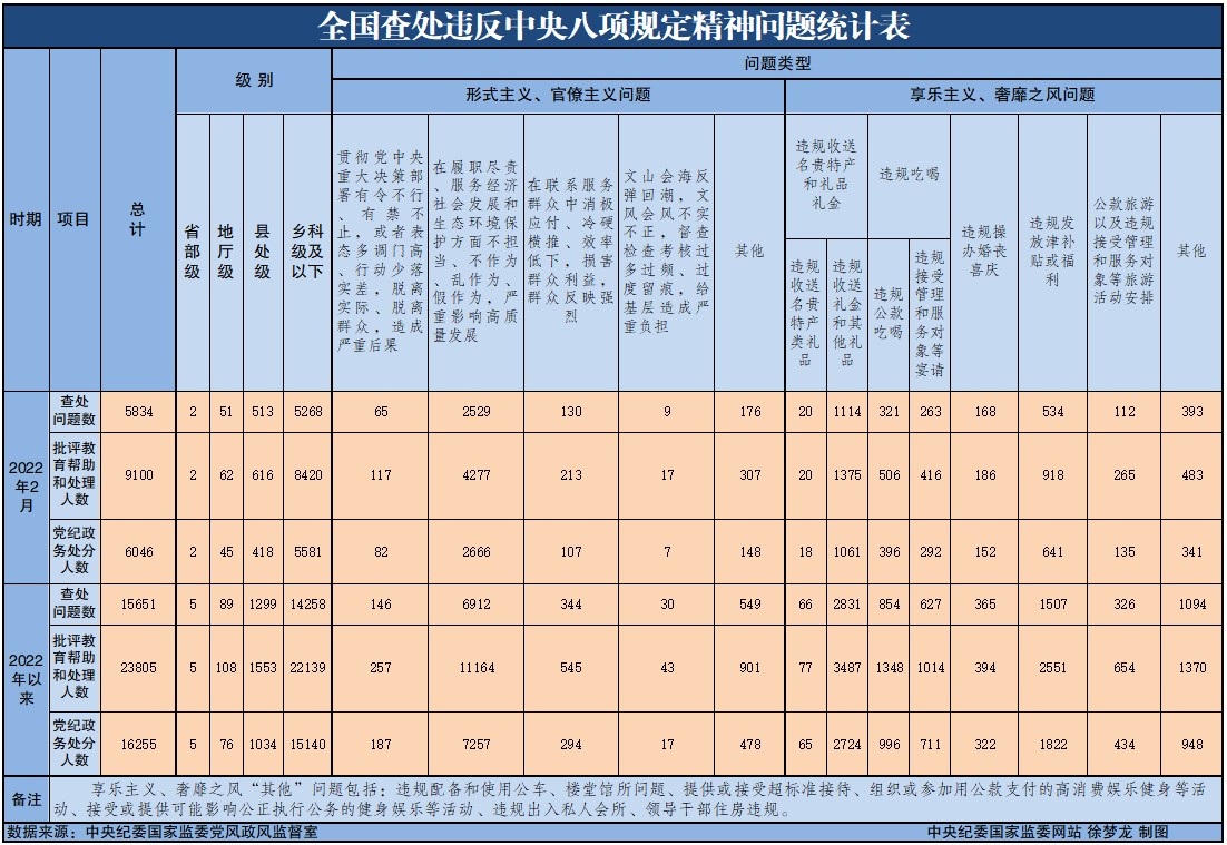 3月27日,中央纪委国家监委公布了2022年2月全国查处违反中央八项规定精神问题汇总情况。当月,全国共查处违反中央八项规定精神问题5834起,批评教育帮助和处理9100人,其中,党纪政务处分6046人。这是中央纪委国家监委连续第102个月公布月报数据。
