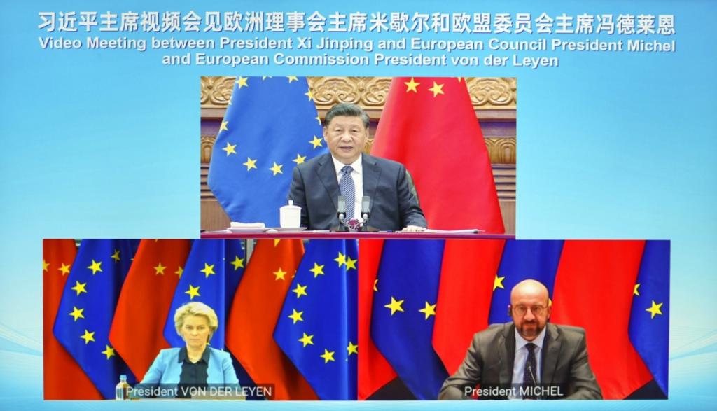 4月1日晚,国家主席习近平在北京以视频方式会见欧洲理事会主席米歇尔和欧盟委员会主席冯德莱恩。 新华社记者 殷博古 摄