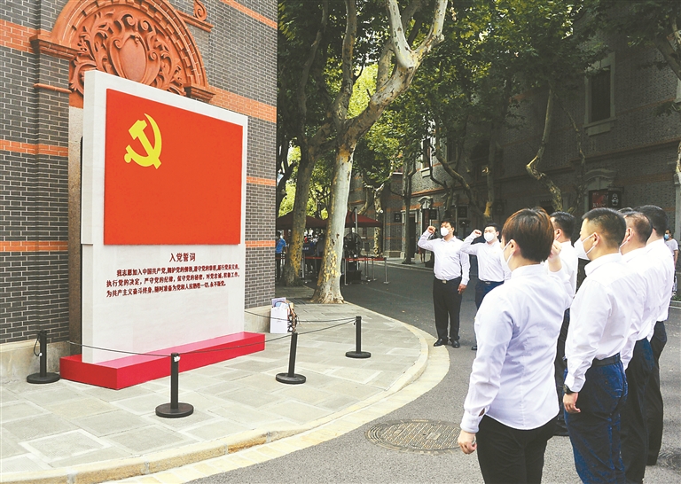 图为近日,在上海中共一大纪念馆展馆外的黄陂南路口,来自基层党组织的新党员在党旗下宣誓,老党员重温入党誓词。 (图片来源:人民视觉)