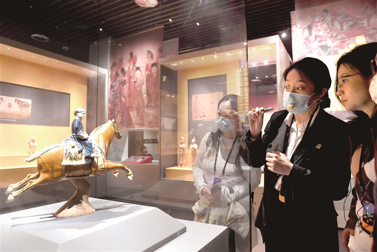 近日,游客在西安博物院参观唐代三彩腾空马。飞腾的三彩马上骑有一胡俑,真实再现了丝绸之路上西域胡人急奔长安的生动形象。新华社记者 李一博 摄