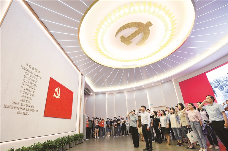 图为党员在上海中共一大纪念馆里重温入党誓词。新华社记者 刘颖 摄