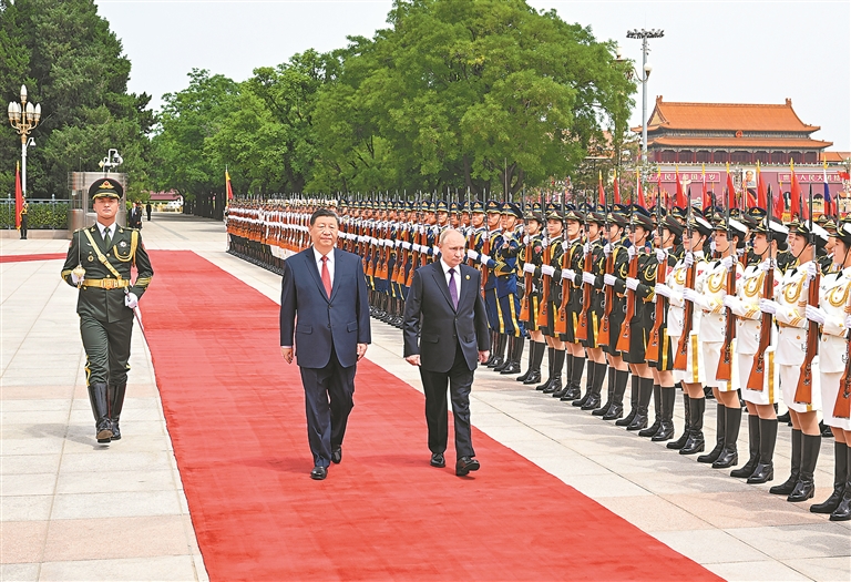 5月16日上午,国家主席习近平在北京人民大会堂同来华进行国事访问的俄罗斯总统普京举行会谈。这是会谈前,习近平在人民大会堂东门外广场为普京举行隆重欢迎仪式。新华社记者 饶爱民 摄