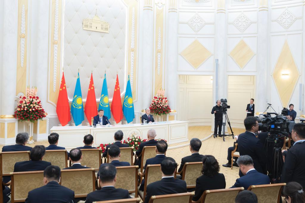 习近平指出,这是我第五次访问友好邻邦哈萨克斯坦,也是我同托卡耶夫总统时隔9个月再次会晤。刚才我同托卡耶夫总统举行了亲切友好、富有成果的会谈,达成广泛共识,共同签署了《中华人民共和国和哈萨克斯坦共和国联合声明》,共同规划两国未来合作重点方向,我们还见证交换了两国多项政府间、部门间合作文件,涉及经贸、互联互通、能源、农业、科技、人文等重点领域,为中哈关系高质量发展注入新动力。
